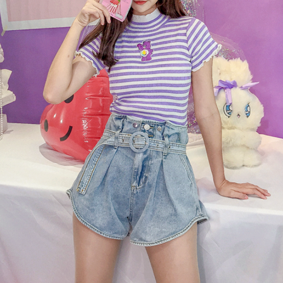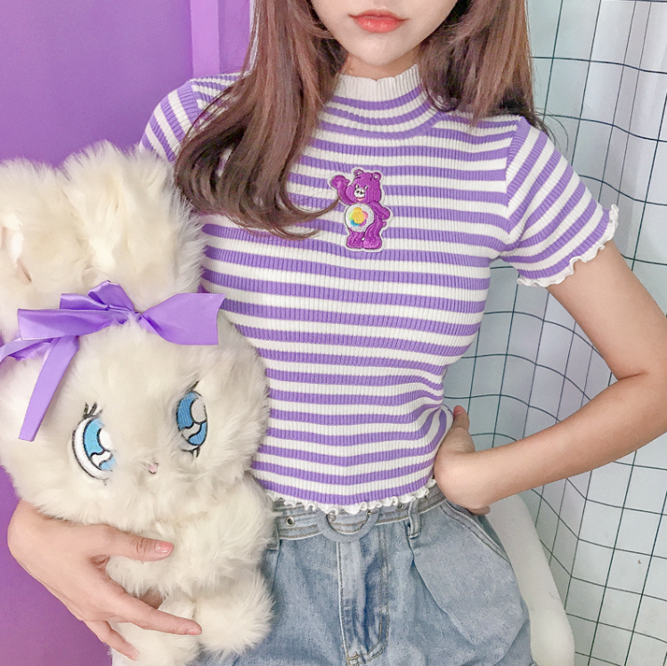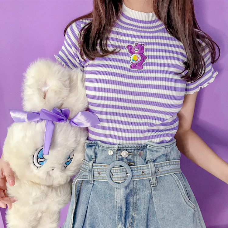 Cute Bear Embroidered Pastel Purple Color Block Stripe Knit Tee