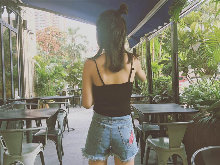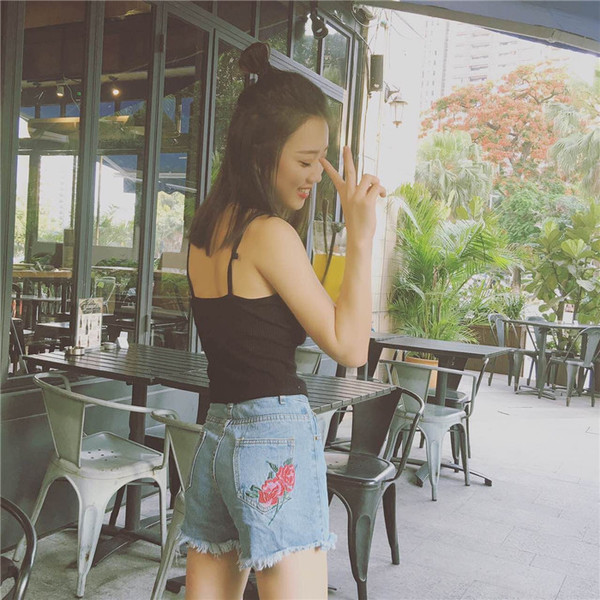 Women's Flowers embroidered retro high waist denim shorts