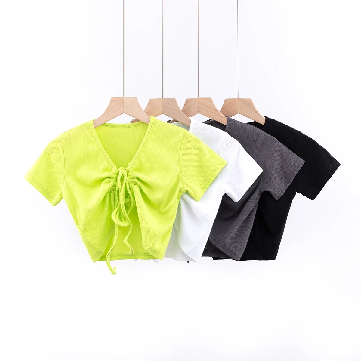 Sexy drawstring tie knotted short open-neck slim-fit short-sleeved T-shirt