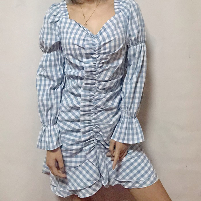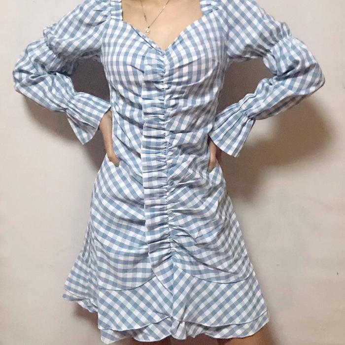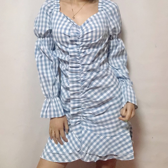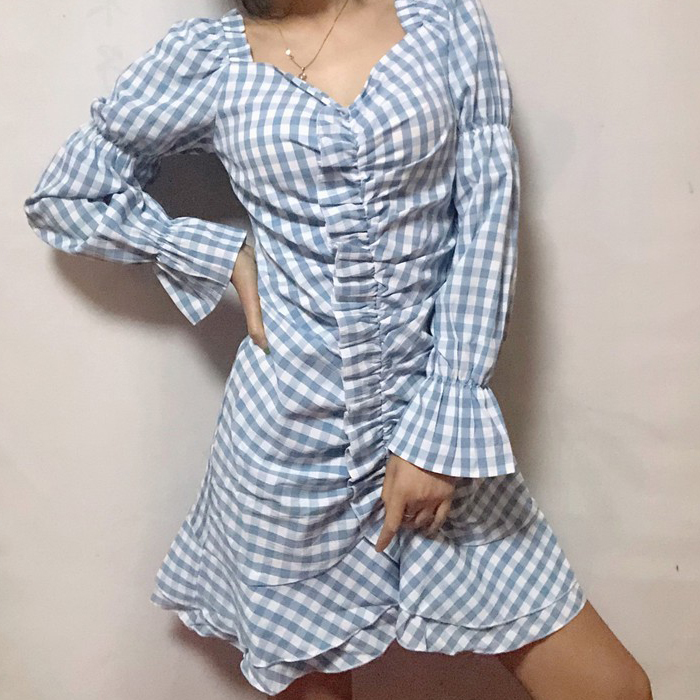 Blue Grid Slim Long Sleeve Dress